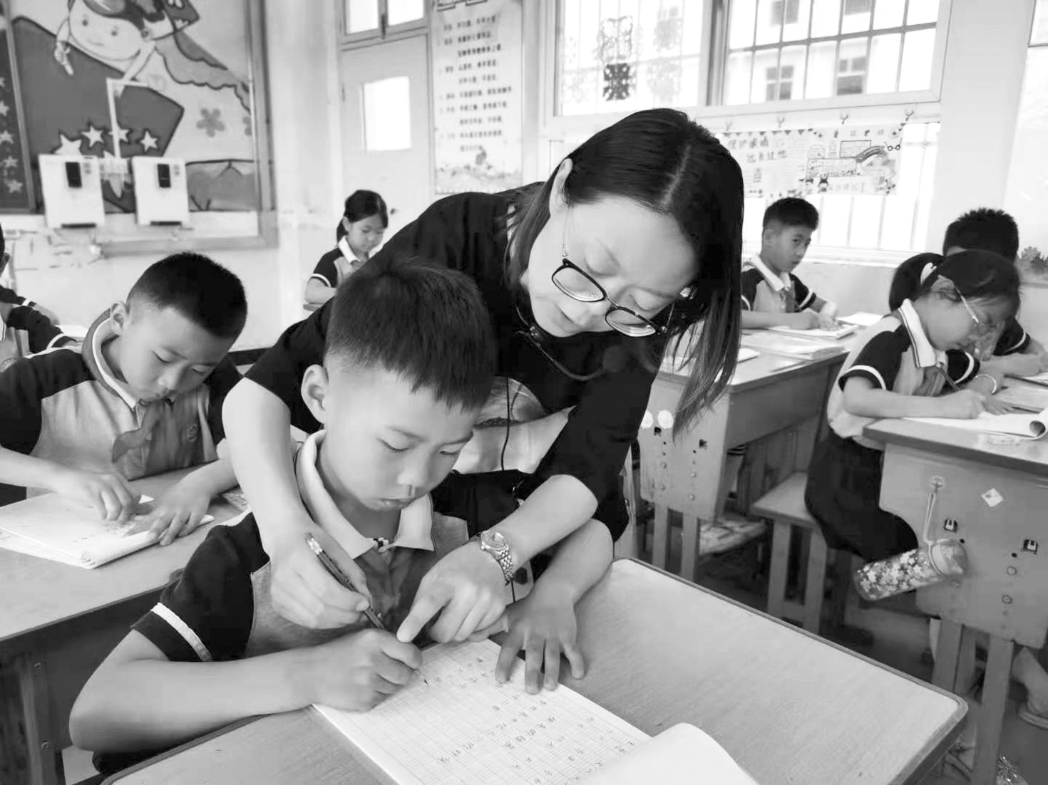 西安市临潼区实验小学二年级2班班主任张莹在纠正学生的握笔姿势。