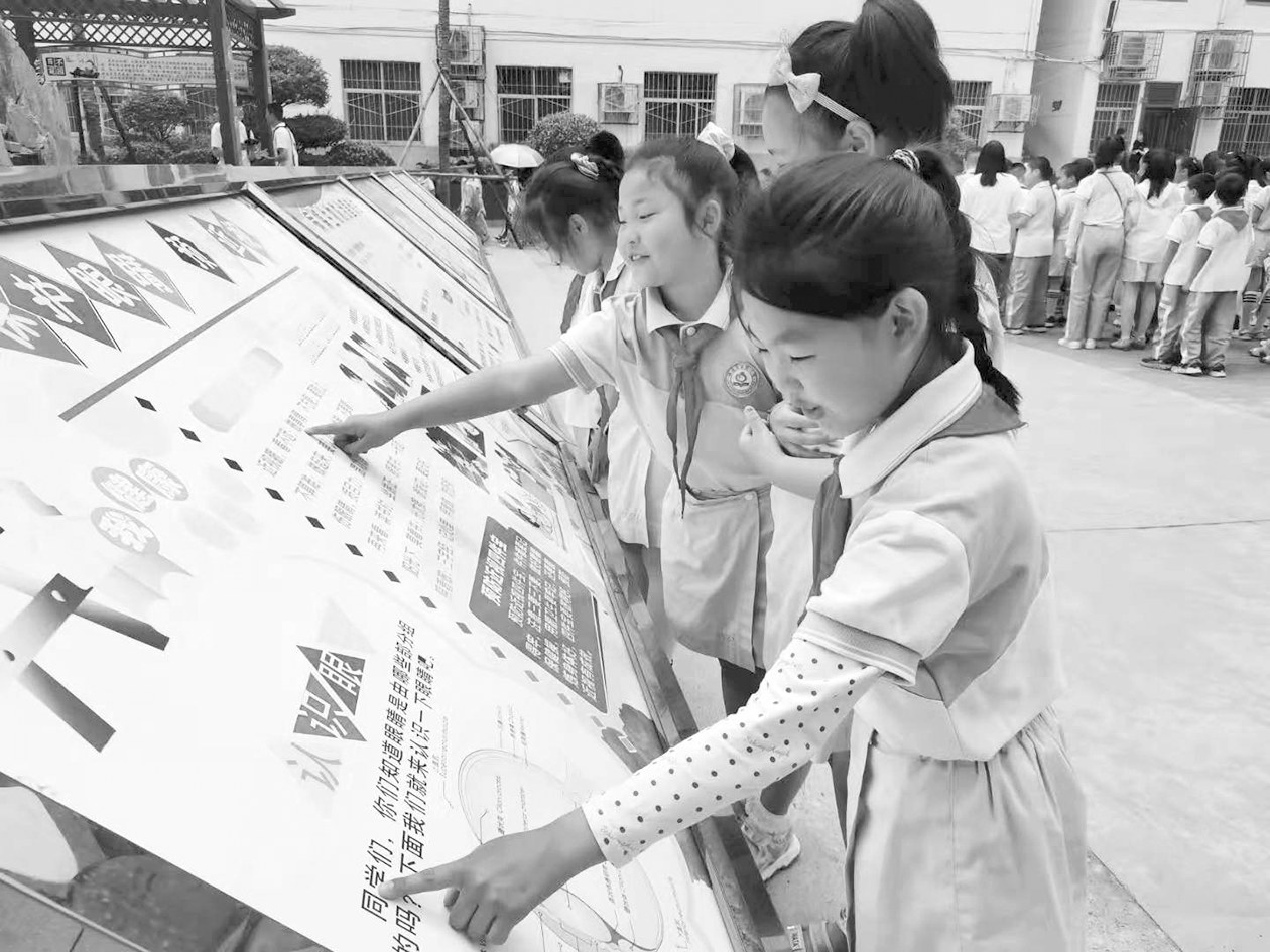 西安市临潼区实验小学的几名学生在近视防治宣传栏前学习。
