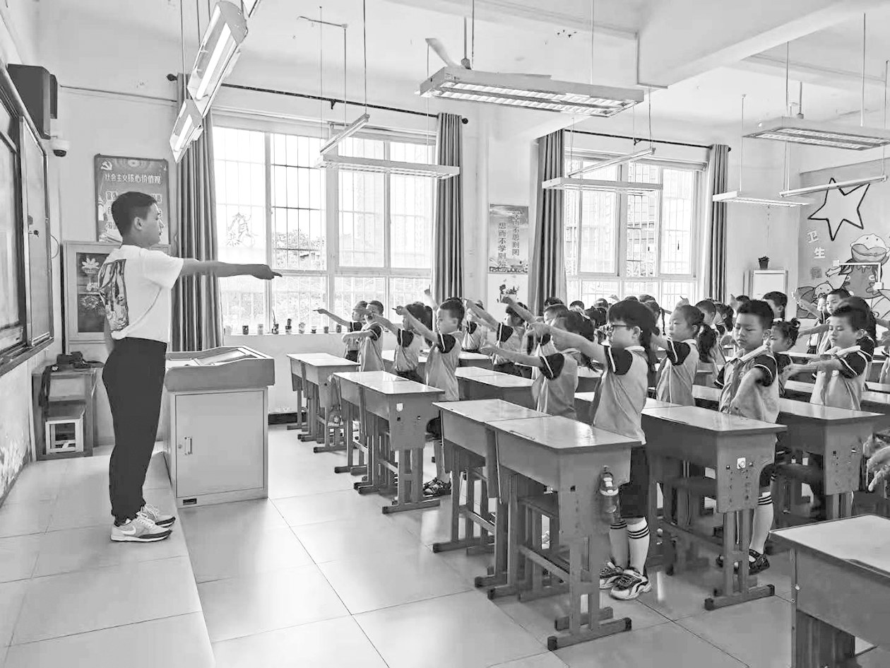 在二年级2班教室里,体育老师郭兆祥正站在讲台上进行标准动作讲解和示范。“目光要跟着手指走,在空中画W和正方形的时候,注意手指上下左右的方向。”听了郭老师的话,孩子们左看看,右看看,做得更加认真了。