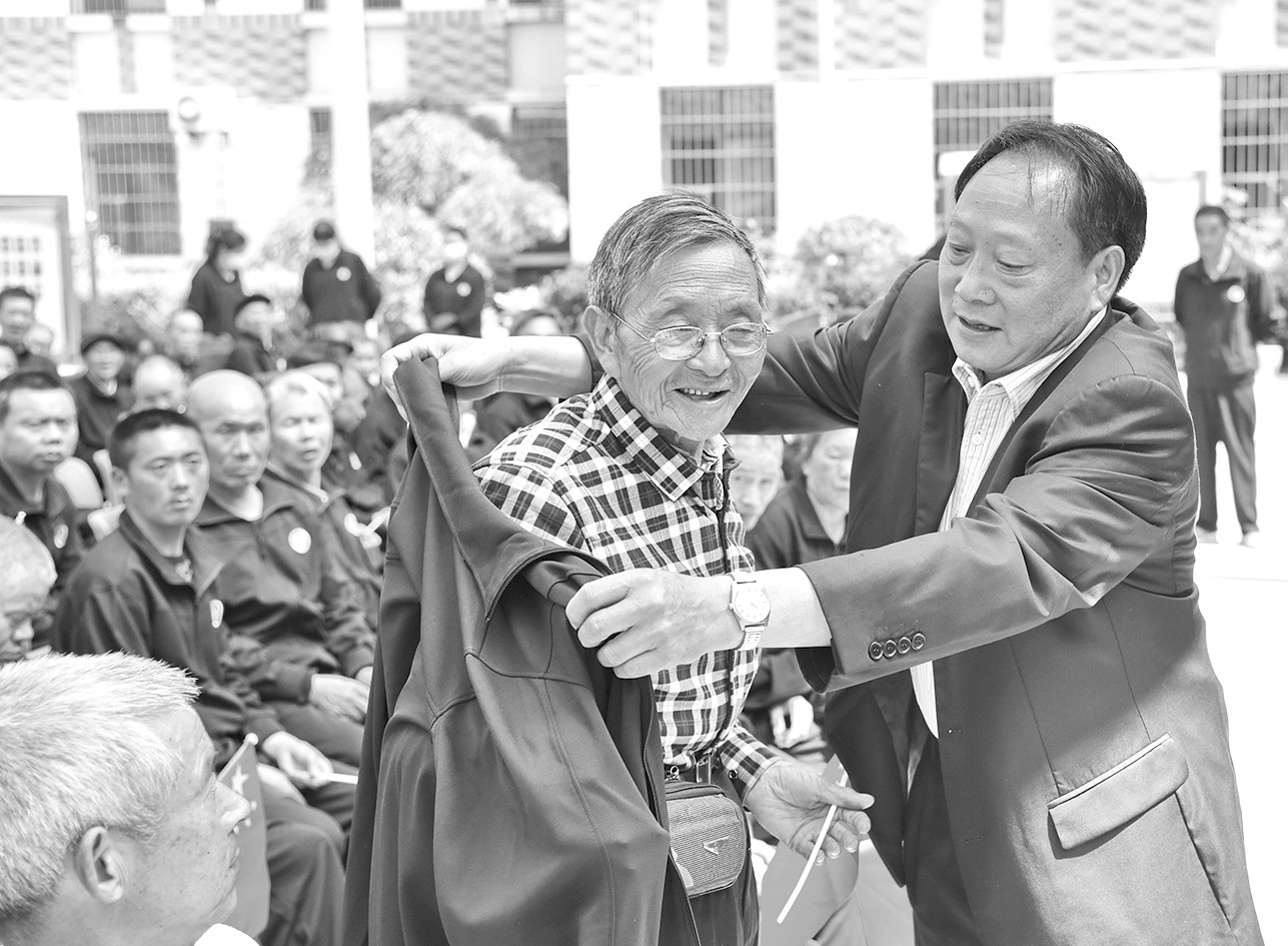 宁强县社会各界为县中心敬老院的孤寡老人捐赠钱物,不断提升他们的生活质量,让其安度晚年。日前,中泰华威国际投资公司为该院的孤寡老人捐赠了价值6万余元的服装。图为爱心人士为老人换上新衣。