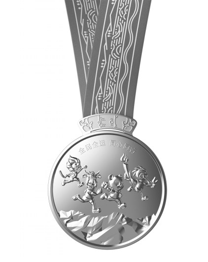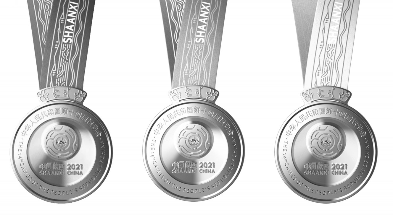 奖牌背面 据新华社电 6月7日,第十四届全运会迎来开幕倒计时100天。在西安举行的晚会上,十四运会火炬“旗帜”、奖牌、火种灯“圆梦”、圣火盆“曙光”、采火棒“繁荣”、参赛纪念奖杯“汇聚”和颁奖礼仪服饰“青山绿水”等一系列视觉形象揭开了神秘面纱。