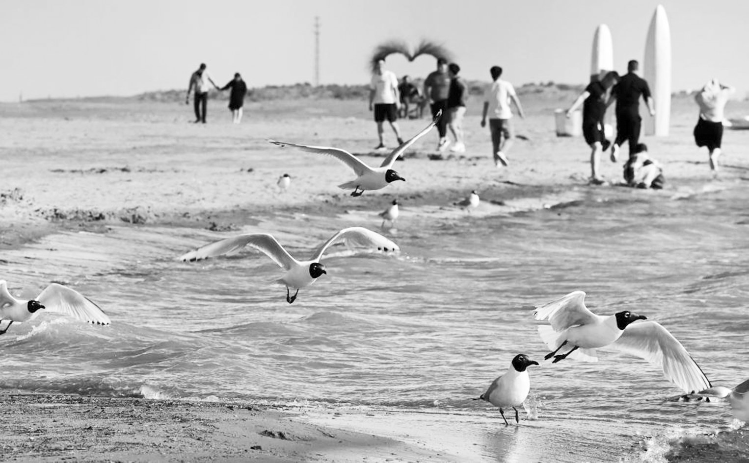6月2日,游人在红碱淖景区游玩,遗鸥在一旁相伴。