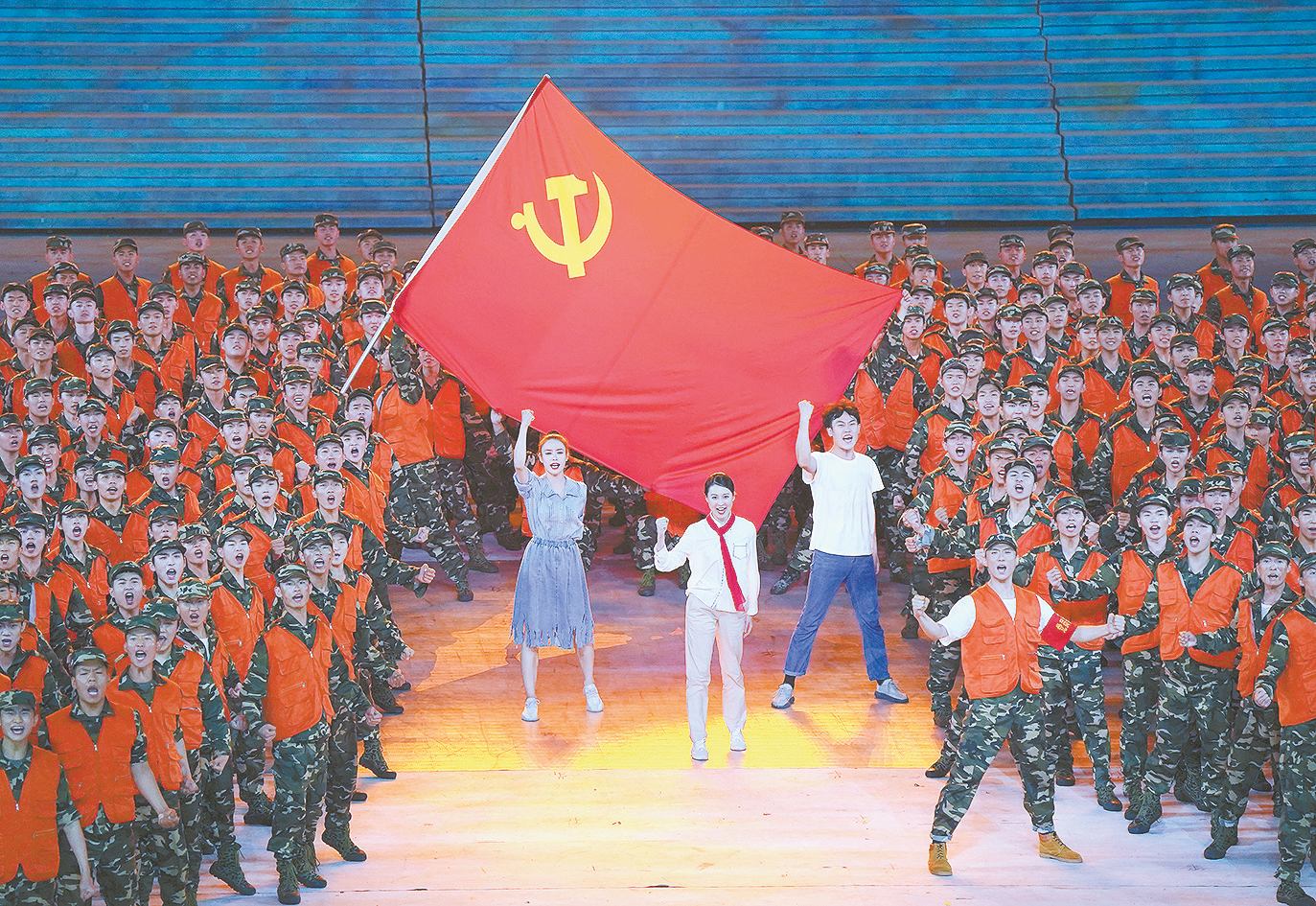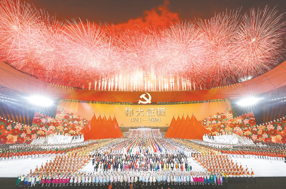 ⑤ 6月28日晚,庆祝中国共产党成立100周年文艺演出《伟大征程》在北京国家体育场盛大举行。这是文艺演出结束,全场共同高唱《没有共产党就没有新中国》。