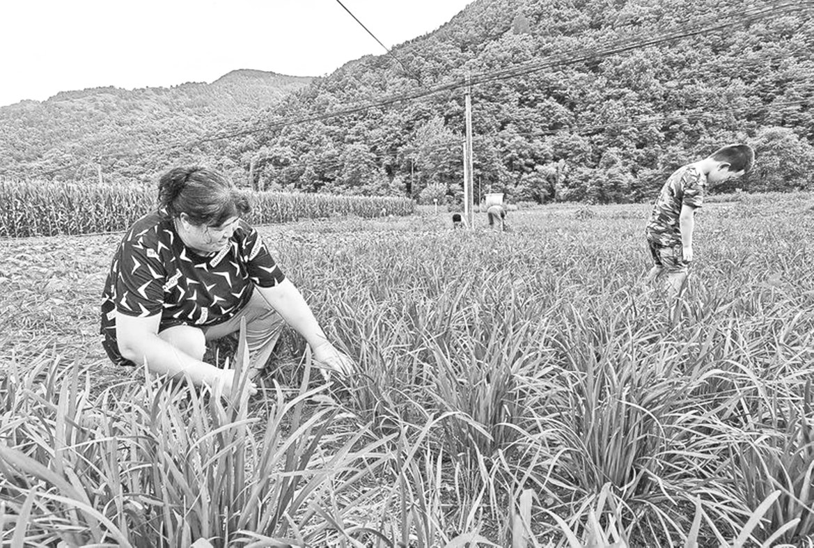 7月7日,商洛市商州区牧护关镇大商塬村村民张文霞正在自家的蔬菜地里采摘韭菜、韭苔。