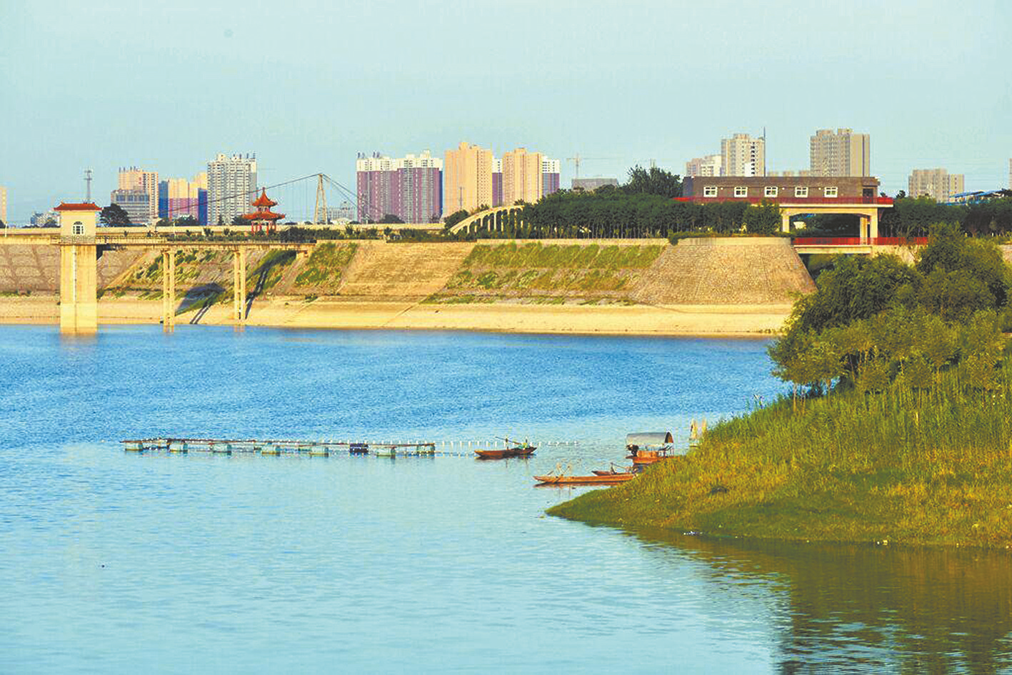 3 渠成风景线 库成风景区 炎炎夏日,行走在陕西省泾惠渠灌溉中心西郊水库的堤坝上,两岸绿树成荫,繁花似锦,不远处,水库管理处主任崔晓亮正在进行日常库区巡查。