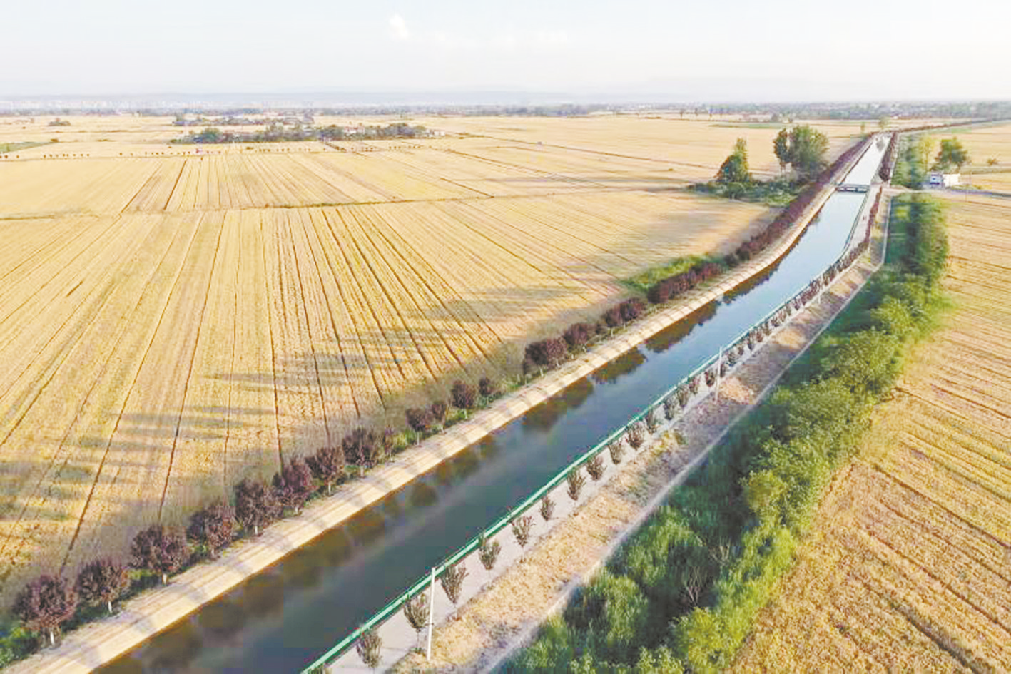 省交口抽渭灌区田市站前总干渠夏灌航拍图。(资料图) 本报记者 王东宇
