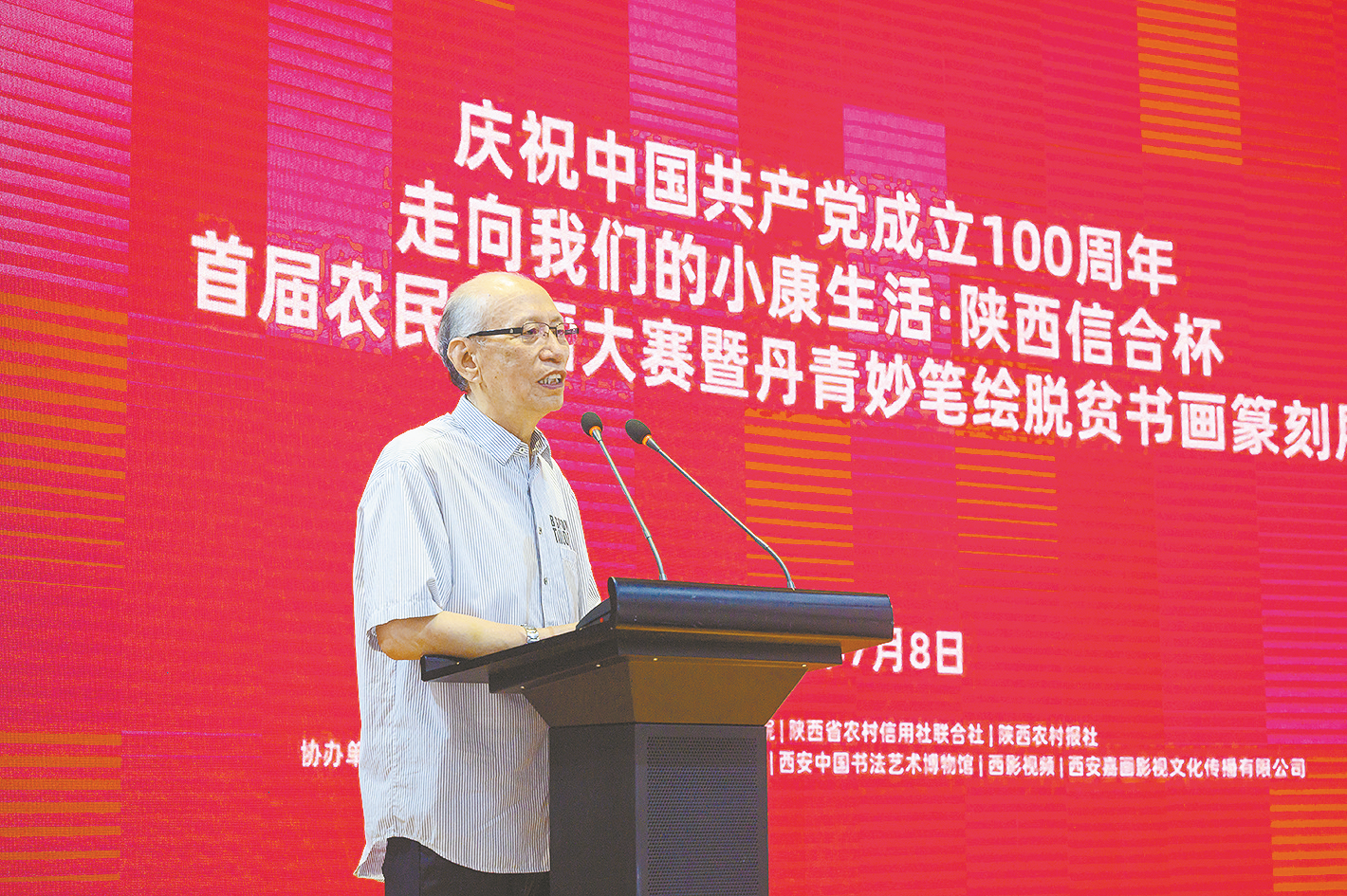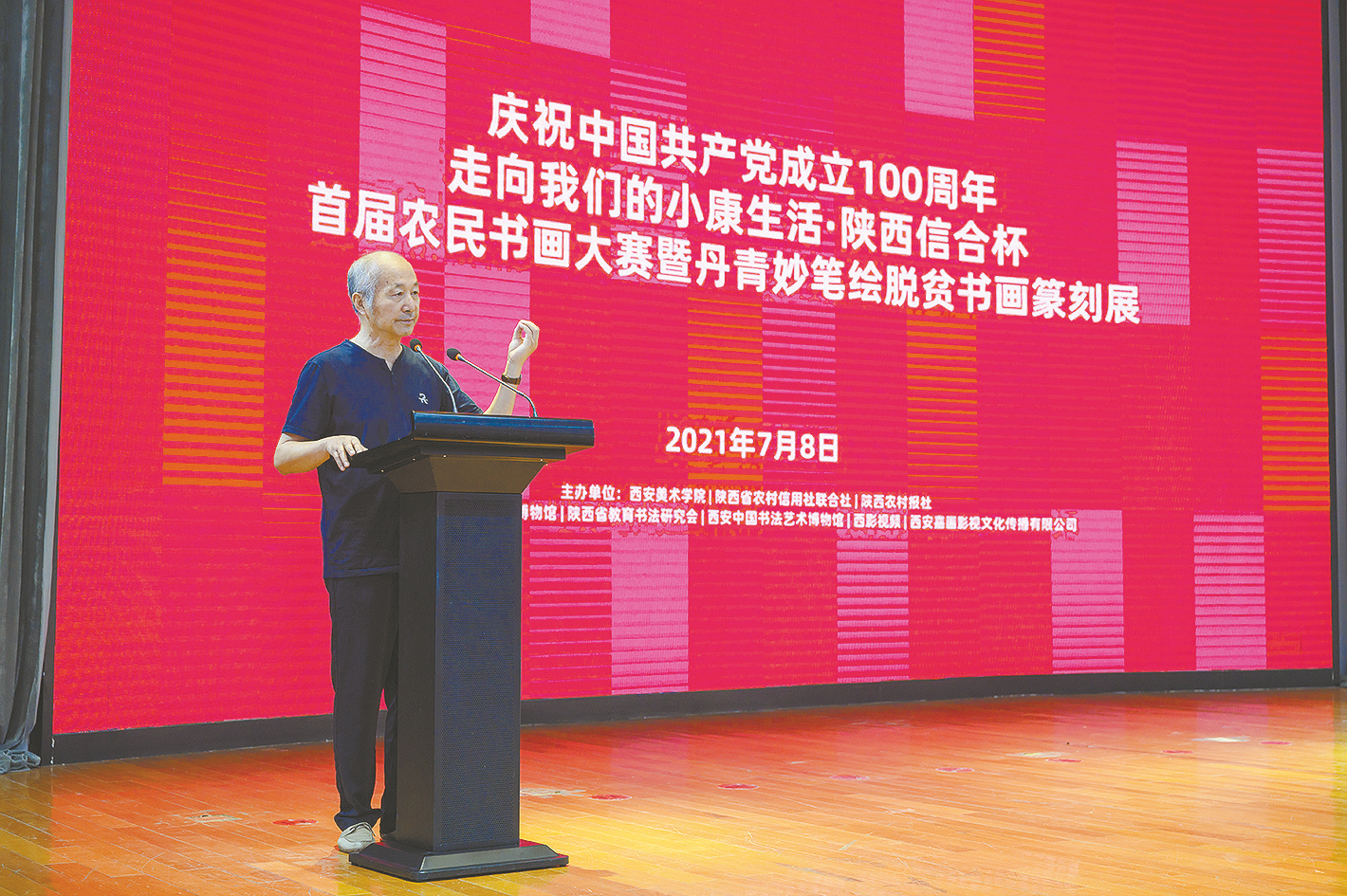 开幕式上,陕西省农村信用社联合社主任田亚欧宣读大赛获奖作者名单;西安美术学院教授程征代表大赛活动顾问、评审会专家发言;陕西省书法家协会名誉主席、陕西省望贤书学会会长李成海代表省书协讲话;陕西省美术家协会副主席巨石代表省美协讲话;陕西省农村信用社联合社党委书记、理事长毛亚社代表主办方讲话;最后,西安美术学院党委副书记、院长朱尽晖宣布展览开幕。