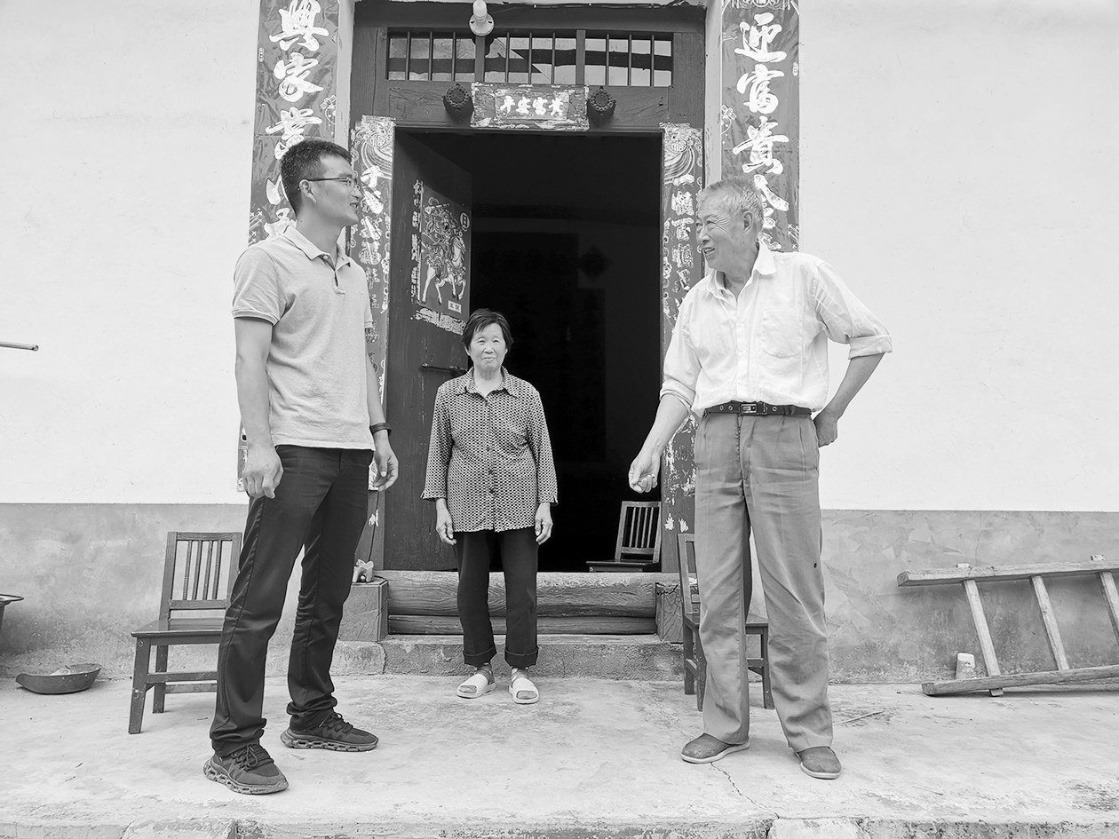 75岁老党员胡仕荣(右一)介绍救灾情况。