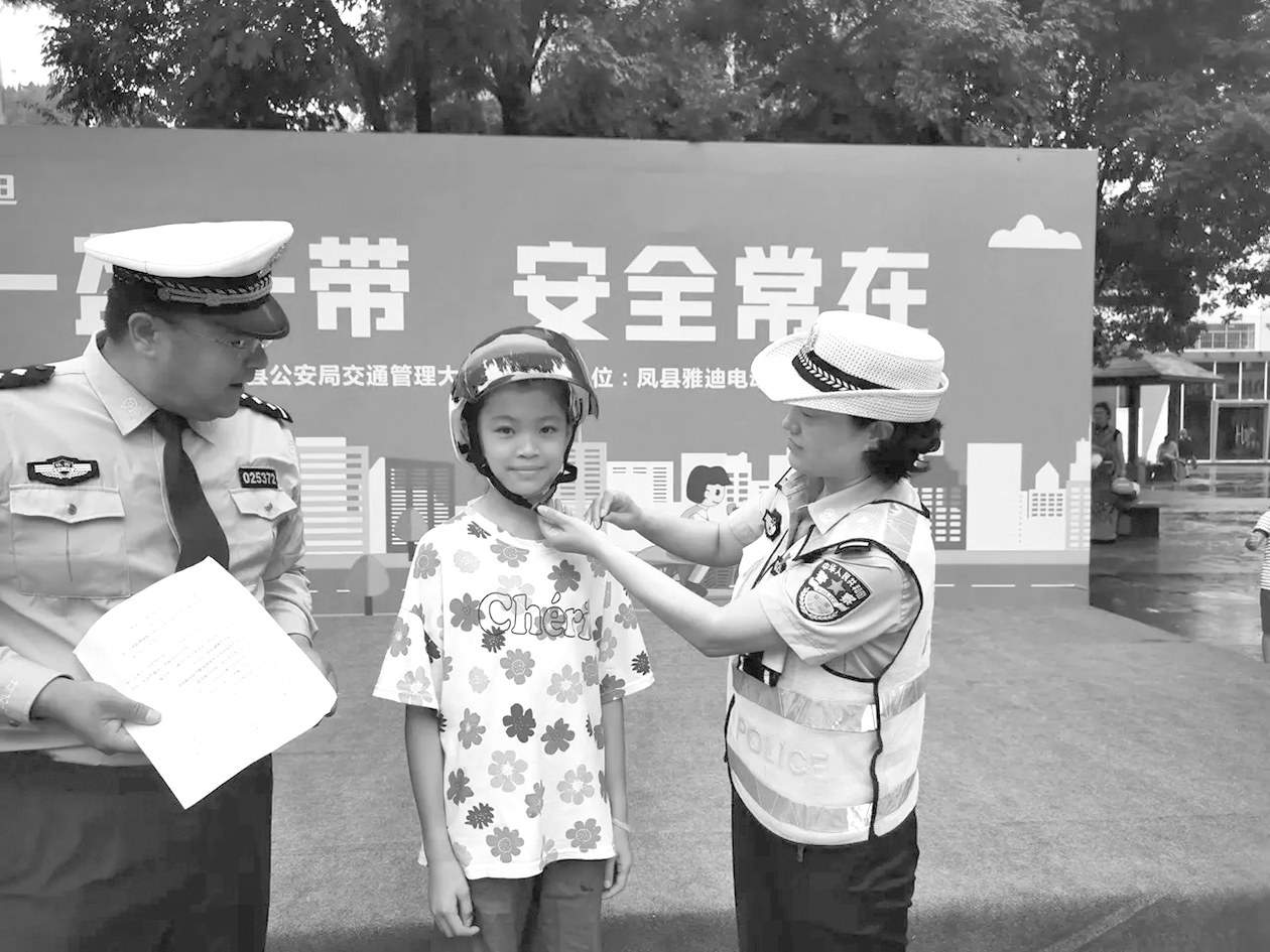 本报讯(记者 韩小珍 文/图)8月19日,凤县公安局交管大队在该县中心广场开展“一盔一带安全常在”交通安全知识有奖答题赠头盔宣传活动。