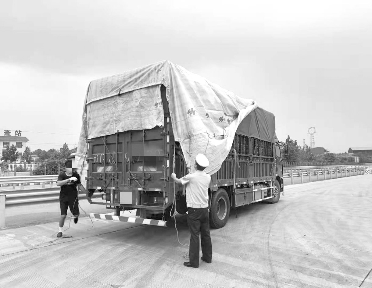 民警示意驾驶员靠边停车,并立即上前查看情况。经查看,民警发现该车并非出现故障,而是车厢篷布在行驶中被风掀开,一车花椒裸露在外。眼看就要下雨,民警立即帮助货车驾驶员将篷布绳索紧紧固定,避免货物不受损失。