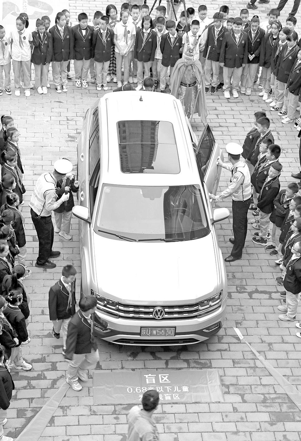 9月3日,渭南市临渭区丰荫明德小学,民警以现场体验的方式教学生识别车辆盲区。