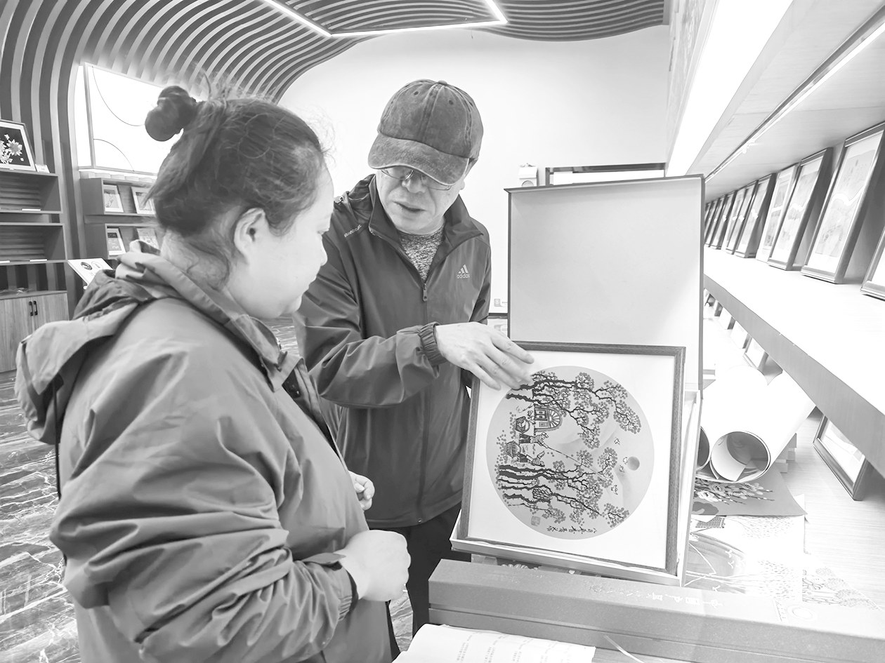 9月23日,快递员程宵(左)与西安市鄠邑区中国户县农民画展览馆馆长王文吉(右)正在认真核对快递信息,确保每幅农民画完好无损地送到购买者手中。