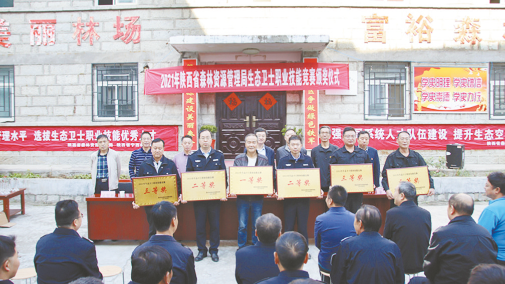 生态卫士职业技能竞赛颁奖现场。 本报讯(苏敏)9月7日至9日,省森林资源管理局2021年生态卫士职业技能竞赛在省宁西林业局皇冠林场举办。省林业局党组成员、省森管局党委书记、局长田瑞出席竞赛开幕式并讲话。活动由省森管局党委委员、副局长龚立群主持,邀请省林业局相关处室领导、西北农林科技大学专家进行现场指导并作专题讲授。省森管局机关相关处室、局属各林业局及森工医院负责人,各参赛队伍共计50余人参加竞赛。