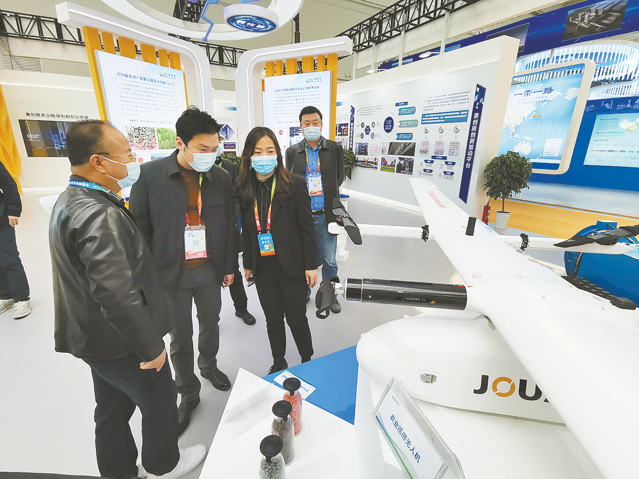 ⑥ 10月24日,在农高会秦创原农业板块,工作人员正向参展商介绍农业摇感无人机自动播种功能。