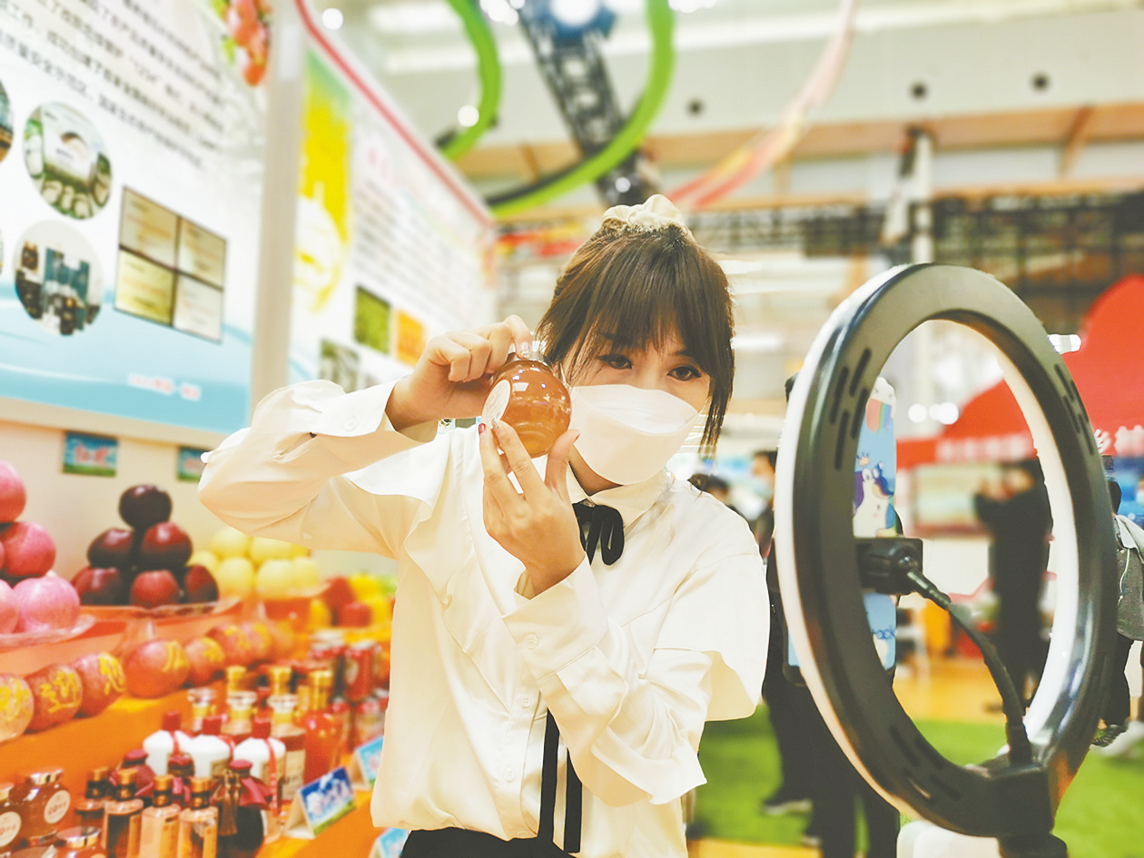 ② 10月22日,在农高会D馆延安市展区,来自延安市富县供销联社工作人员张丽丽正在进行网络直播,向各位网友推荐鄜州蜂蜜。