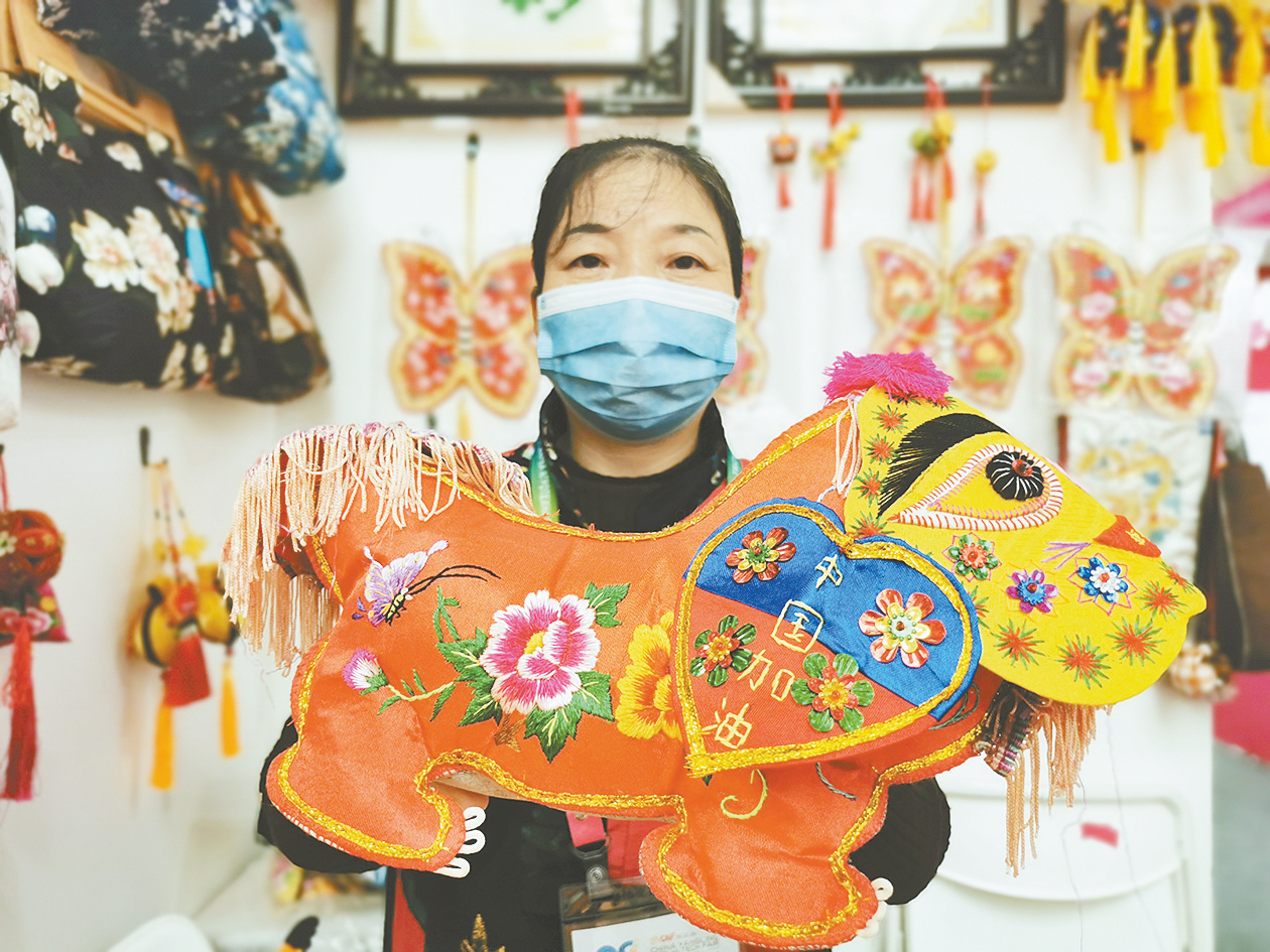 ③ 10月24日,在农高会D馆三秦巧娘手工艺品暨乡村振兴巾帼行动成果展区,铜川市王益区亚侠刺绣专业合作社理事长范亚侠向记者展示原创手工艺品——“醒狮”。
