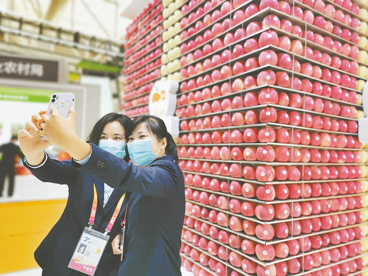 ⑨ ① 10月24日,在农高会D馆咸阳市展区,咸阳“马栏红苹果”礼盒造型吸引观展群众前来“打卡”。