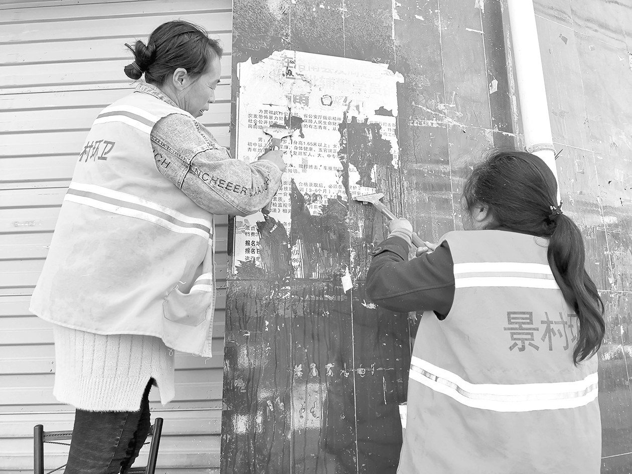 11月1日,洛南县景村镇保洁员正在清理街边小广告。