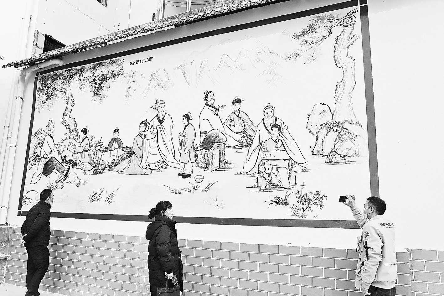 11月15日,商洛市城管部门工作人员正在对城区建筑的旧院墙进行彩绘美化。