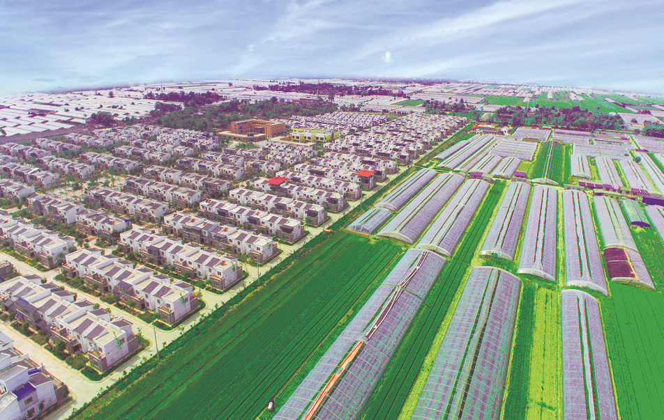 从高处俯瞰何村,千亩蔬菜基地与整齐划一的民居交相辉映。(资料图)