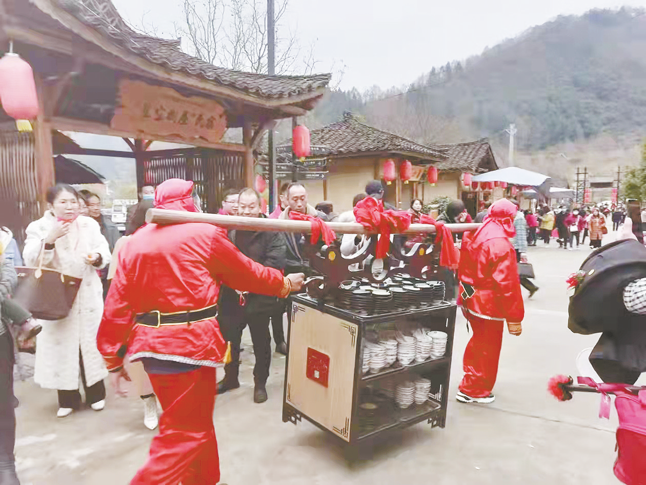 11月21日,在作坊小镇里举办庖汤宴,专人抬着送菜。