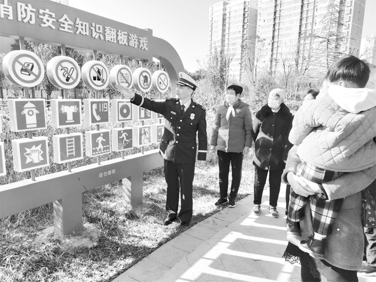 整个公园具有鲜明的消防主题特色,集观赏性、教育性、互动性为一体,可使广大市民在休闲娱乐中了解如何防范、应对火灾,以及如何进行火场逃生等基本常识。图为消防员向群众介绍消防常识。
