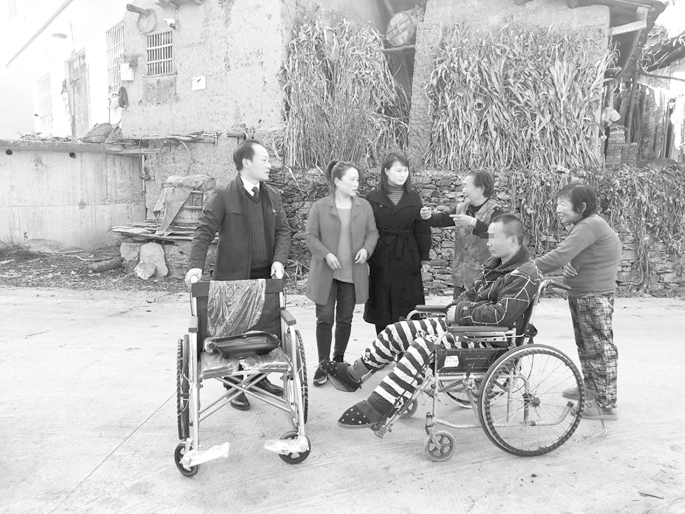 11月18日,旬阳市神河中心卫生院联合神河镇政府工作人员深入辖区金河口社区,开展冬季“深入社区送健康”活动,走访慰问社区贫困残疾人家庭,并对重点人群进行家庭医生签约,为社区居民提供健康咨询服务。图为工作人员为金河口社区四组居民罗先社配发轮椅。