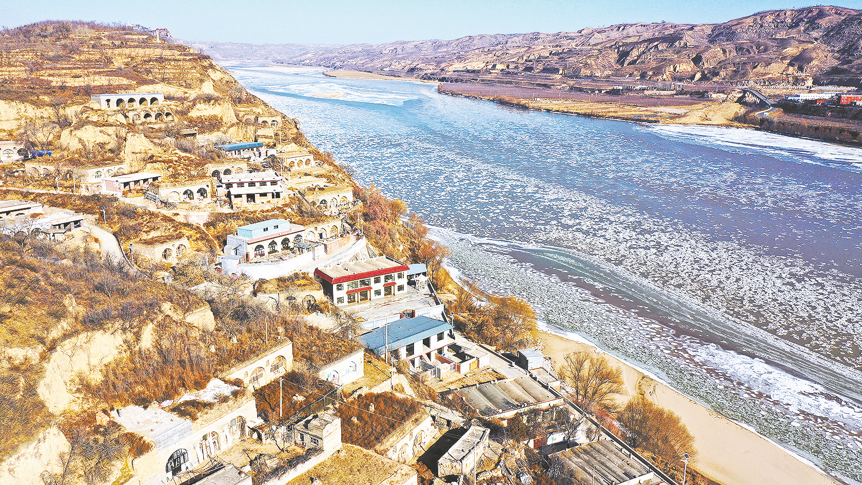 12月21日,在神木市贺家川段,黄河出现大面积冰凌,晶莹剔透的冰块缓缓流淌,在阳光的照耀下,如鳞片般闪闪发亮,更像一簇簇盛开的冰莲花。