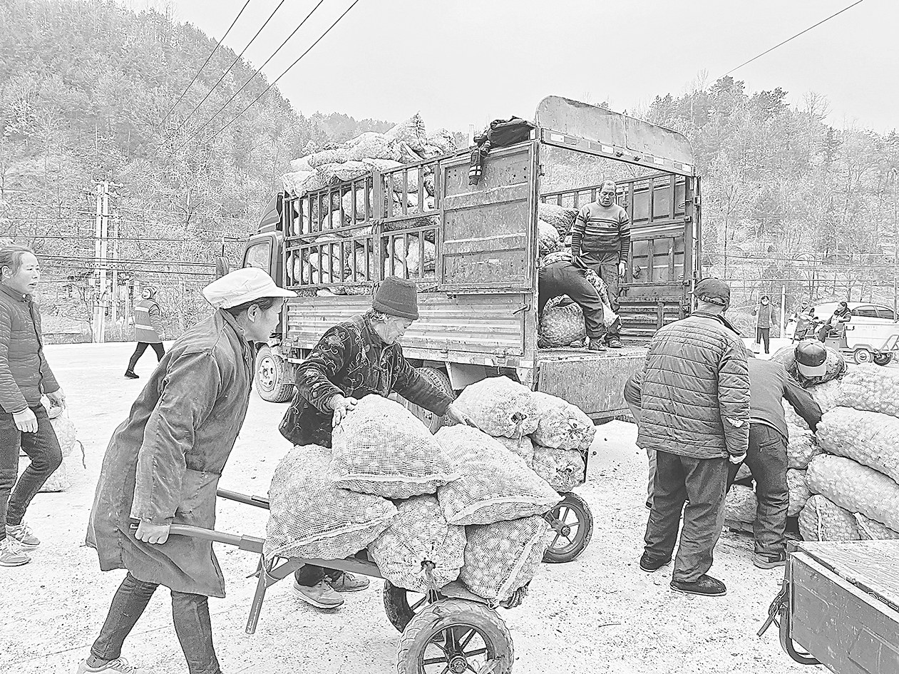 12月19日,在商洛市商州区黑山镇樊川村菊芋收购现场,村民忙着过秤装车。