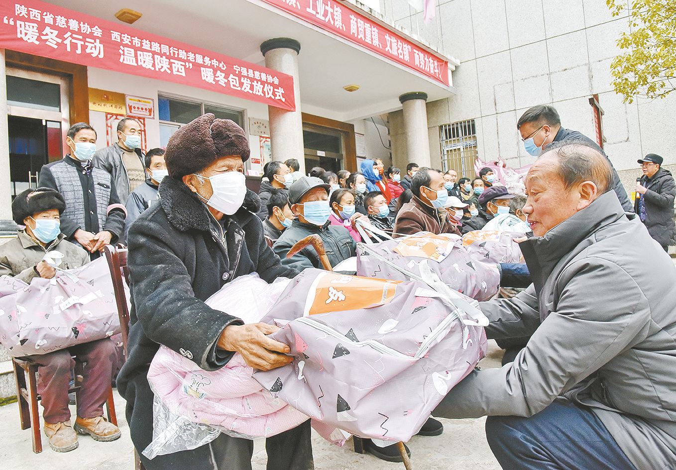 12月28日,宁强县慈善协会在大安镇举行“暖冬行动 温暖陕西”暖冬包发放仪式,现场为105位生活困难老人送去装有棉被、棉鞋、羽绒服的温暖礼包105个,让他们温暖过冬,快乐过新年。图为发放仪式现场。