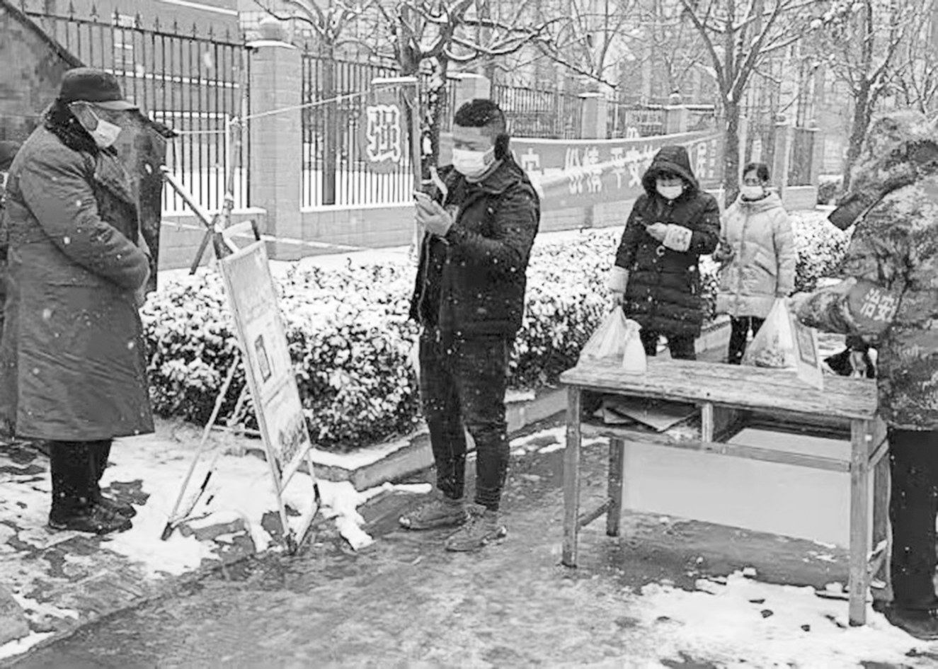 12月25日,在长武县亭口镇,漫天飞舞的雪花装点了屋顶、铺满了大地。亭口镇党员干部在风雪中前行,成了抗疫线上的“排查员”。
