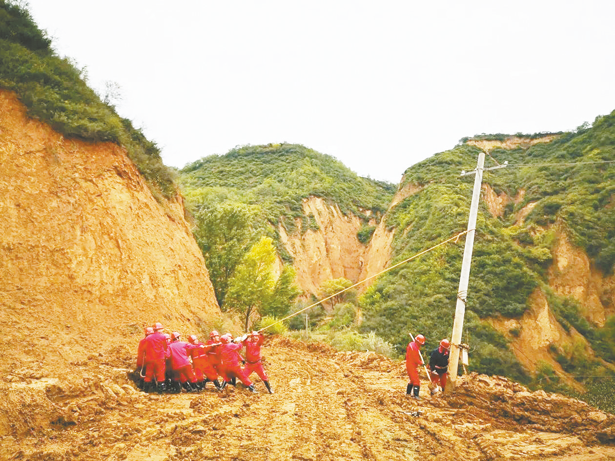 延长石油千里油区因持续强降雨造成基础设施损坏,职工正在齐心协力扶正电线杆,及时恢复电力保生产。 刘一国 杜培华