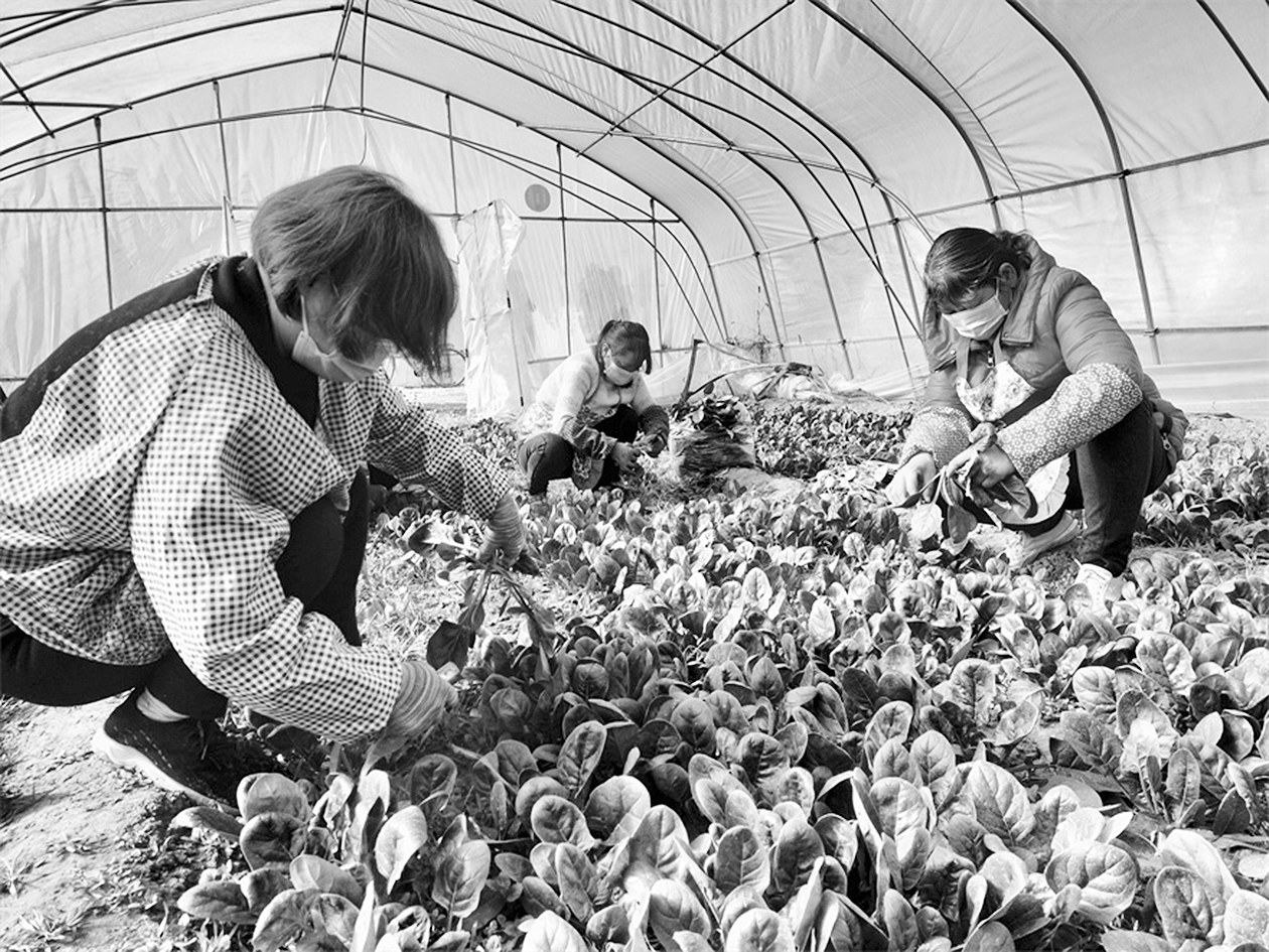 1月15日,在兴平市阜寨镇南佐村的大棚内,村民们戴着口罩正在采摘蔬菜。