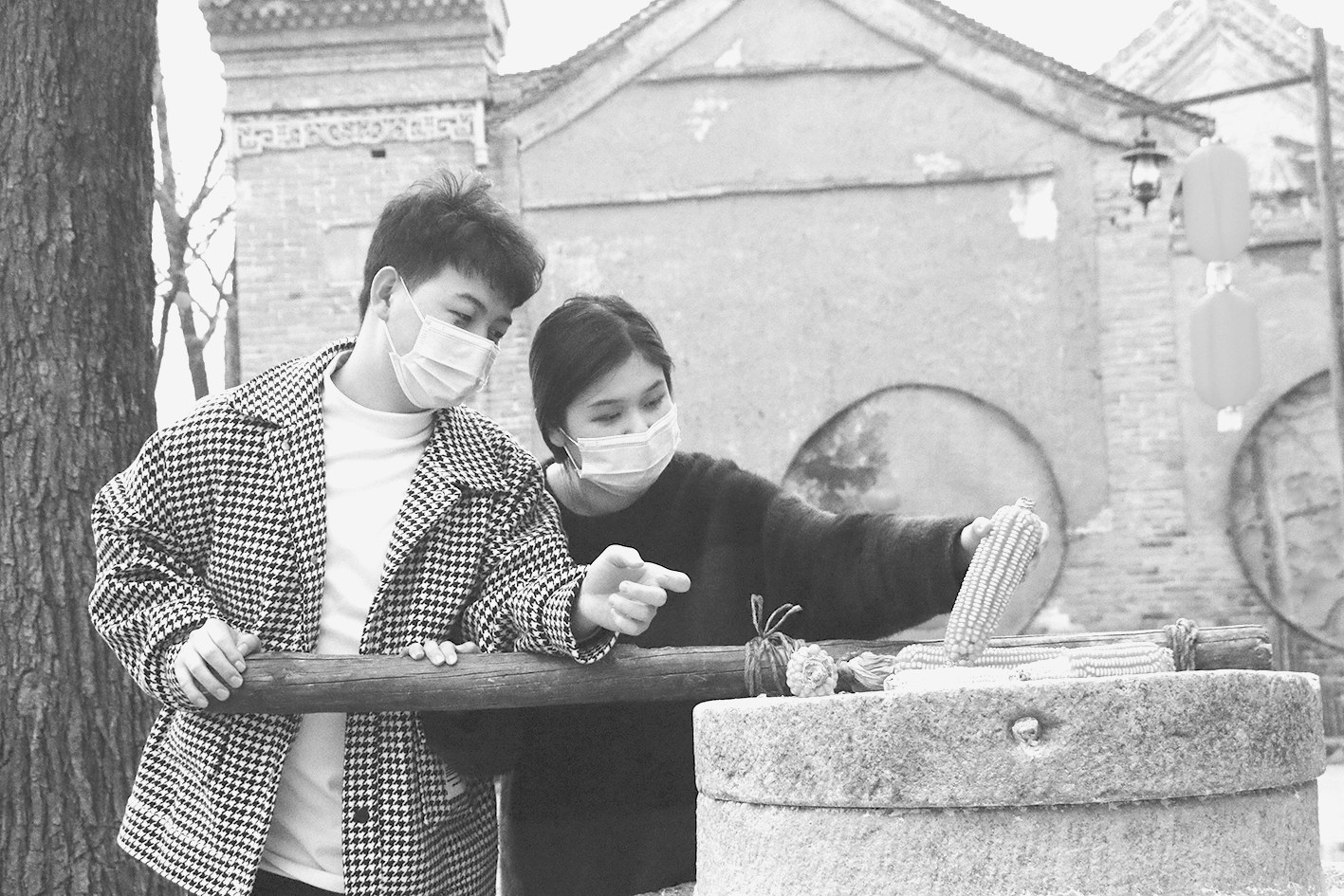 2月12日,在蓝田县白鹿原影视城景区,游客正在用石磨碾磨玉米。