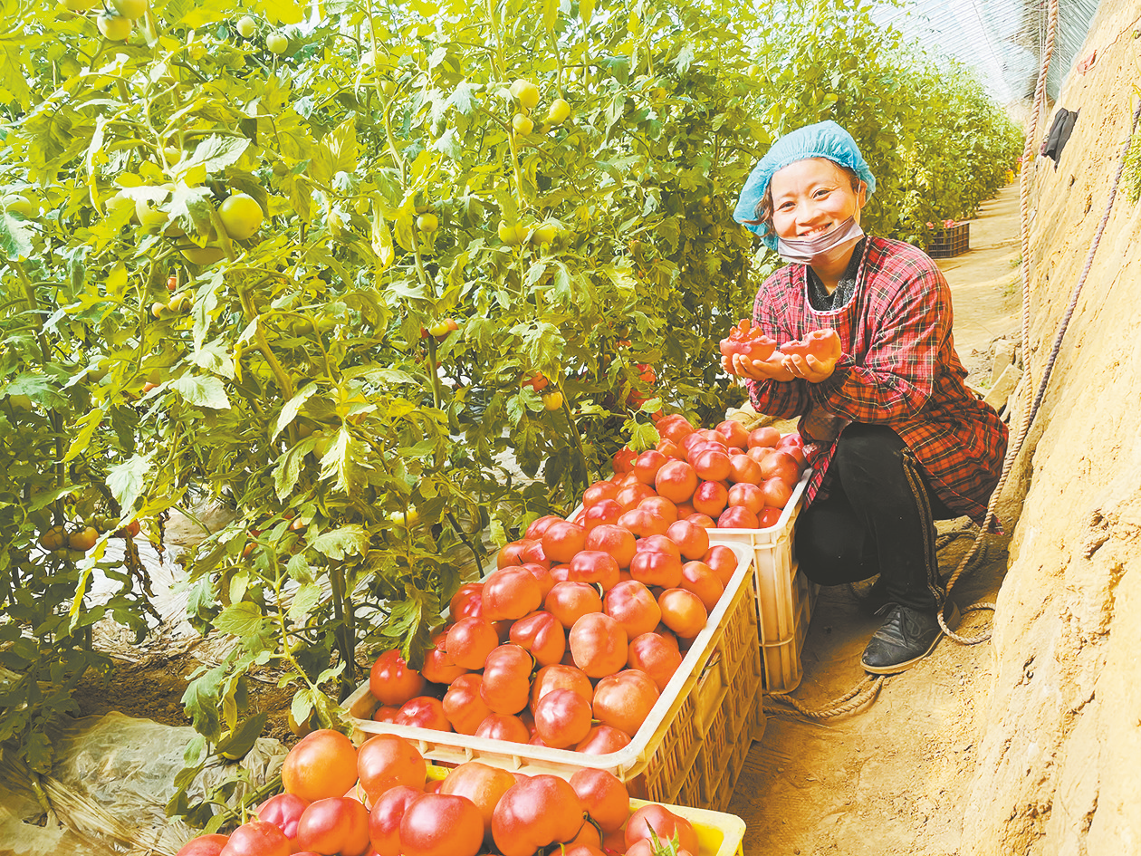 3月14日,在扶风县天度镇齐横村蔬菜大棚里,一串串普罗旺斯西红柿挂在藤蔓上,甚是喜人,村民刘小花正忙着采摘、装筐。