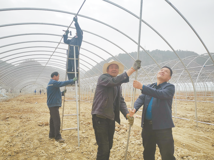 吴向阳(右)正在和村民一起建设大棚。