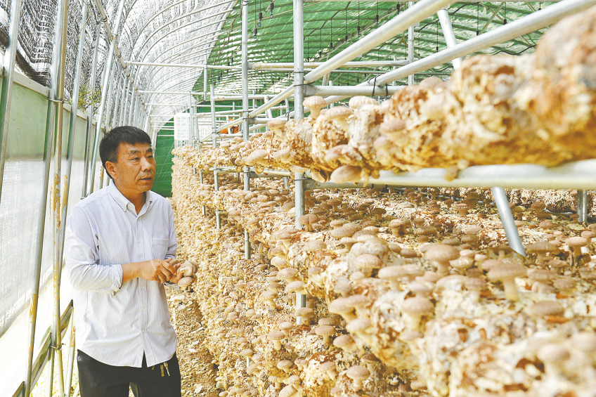 张江在大棚内查看香菇生长。
