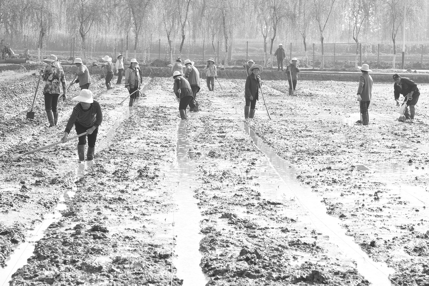 4月8日,在城固县龙头镇水稻育秧中心基地,村民们在平整秧田,准备育秧苗。
