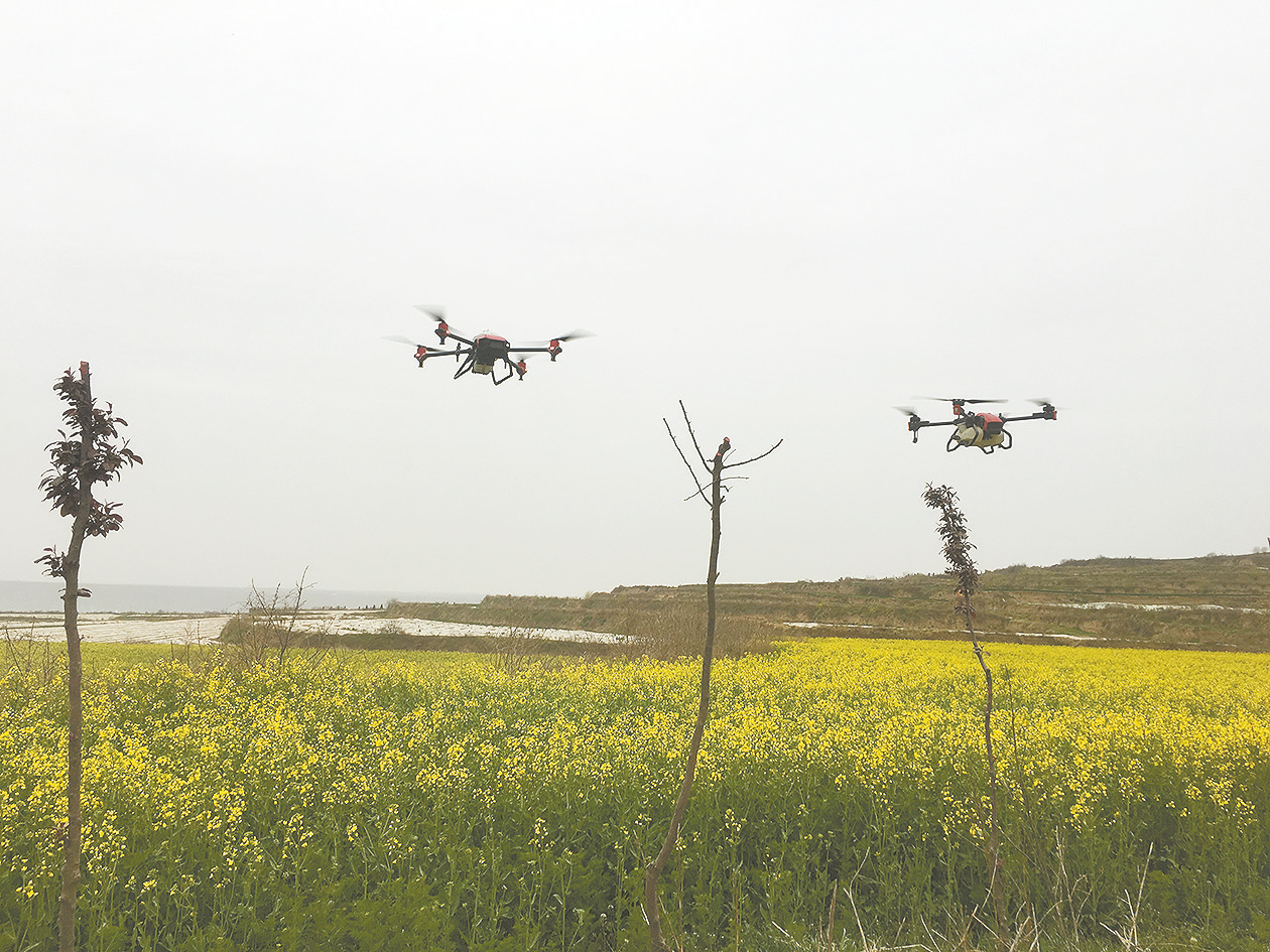 宝鸡市凤翔区陈村镇紫荆村的油菜田里,无人机正在为油菜进行绿色综合防控“一喷四防”。
