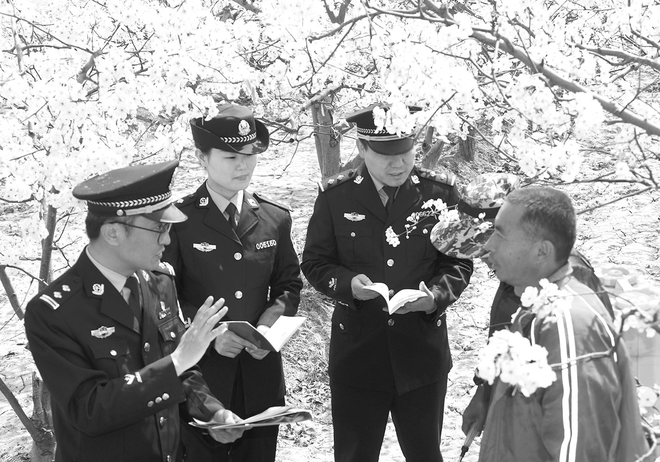 4月6日,大荔县公安局冯村派出所的民警深入辖区的万亩酥梨花海,为游客、果农宣传“防范网络电信诈骗”知识。