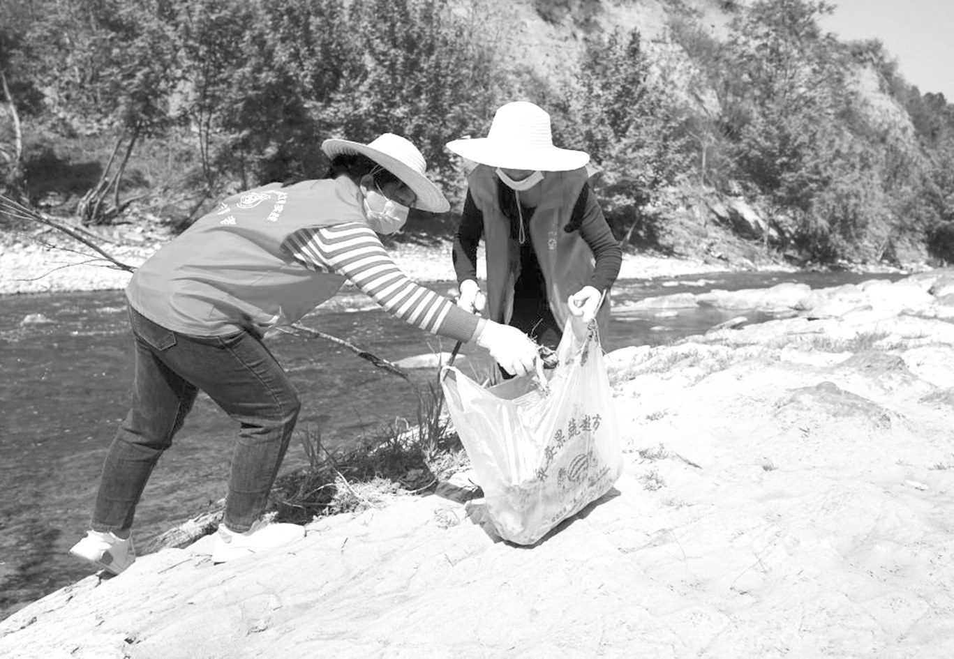 4月10日,女子志愿护河队队员在旬阳市双河镇高坪社区河边捡拾垃圾。