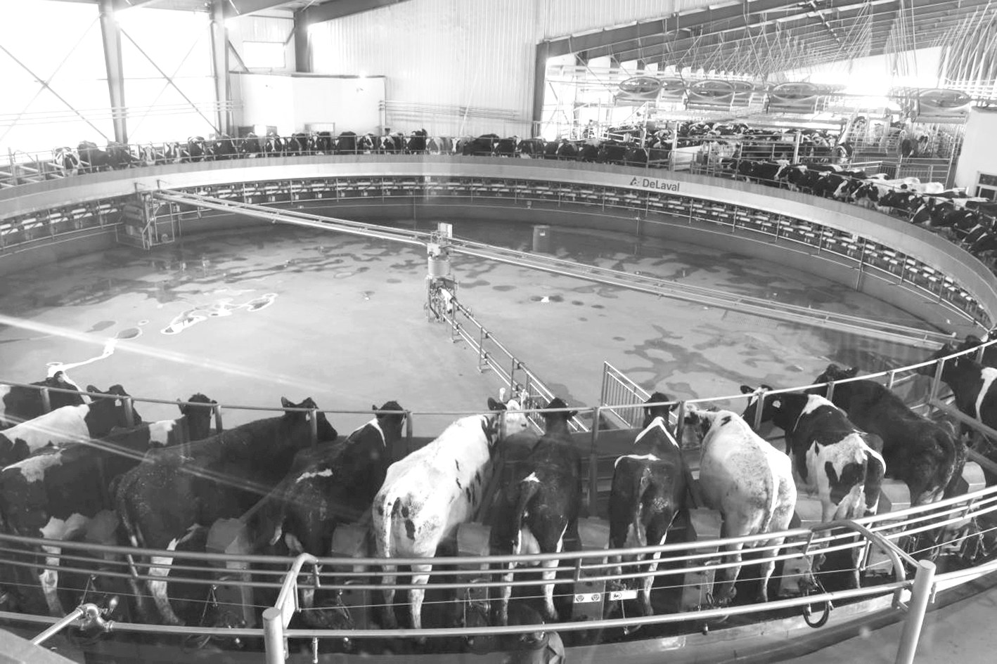 4月23日,在中垦定边智慧生态牧场挤奶厅,随着一头头奶牛有序地走进挤奶台,转盘式挤奶机开始了自动化挤奶工作。