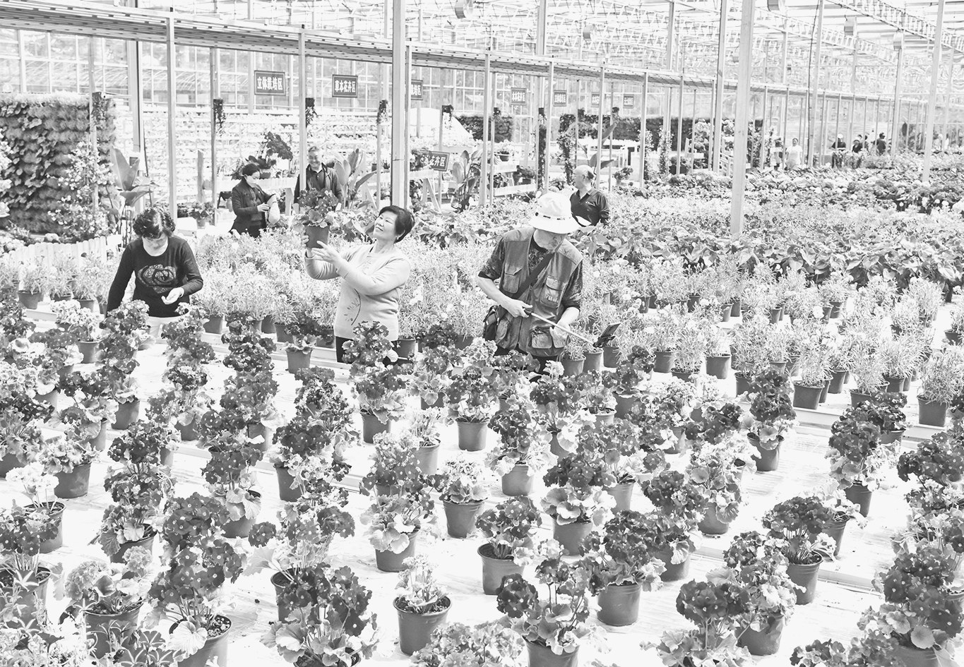 5月12日,宁强县高寨子街道高寨子村村民在三产融合示范园花卉大棚里观赏花卉和蔬菜。