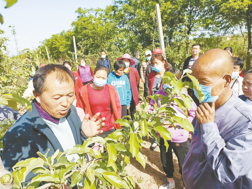 在永寿县常宁镇袁家村,农技专家指导果农进行苹果树修剪。 本报讯(通讯员 李建龙 文/图)5月15日,在永寿县常宁镇袁家村的苹果园里,由袁家村供销综合服务社组织的农技专家服务团正为周边果农上一堂生动的夏季果园管理培训课。