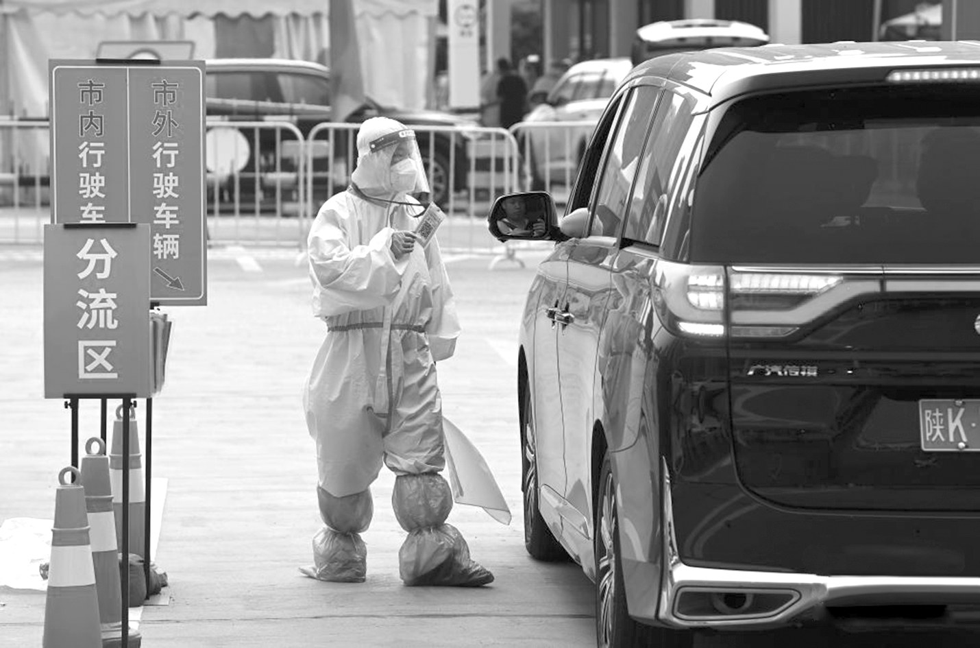 5月21日,在西安绕城高速曲江收费站,工作人员对挡风玻璃上放置有“车辆待查提示牌”的市外行程车辆进行陕西一码通、行程码查验。