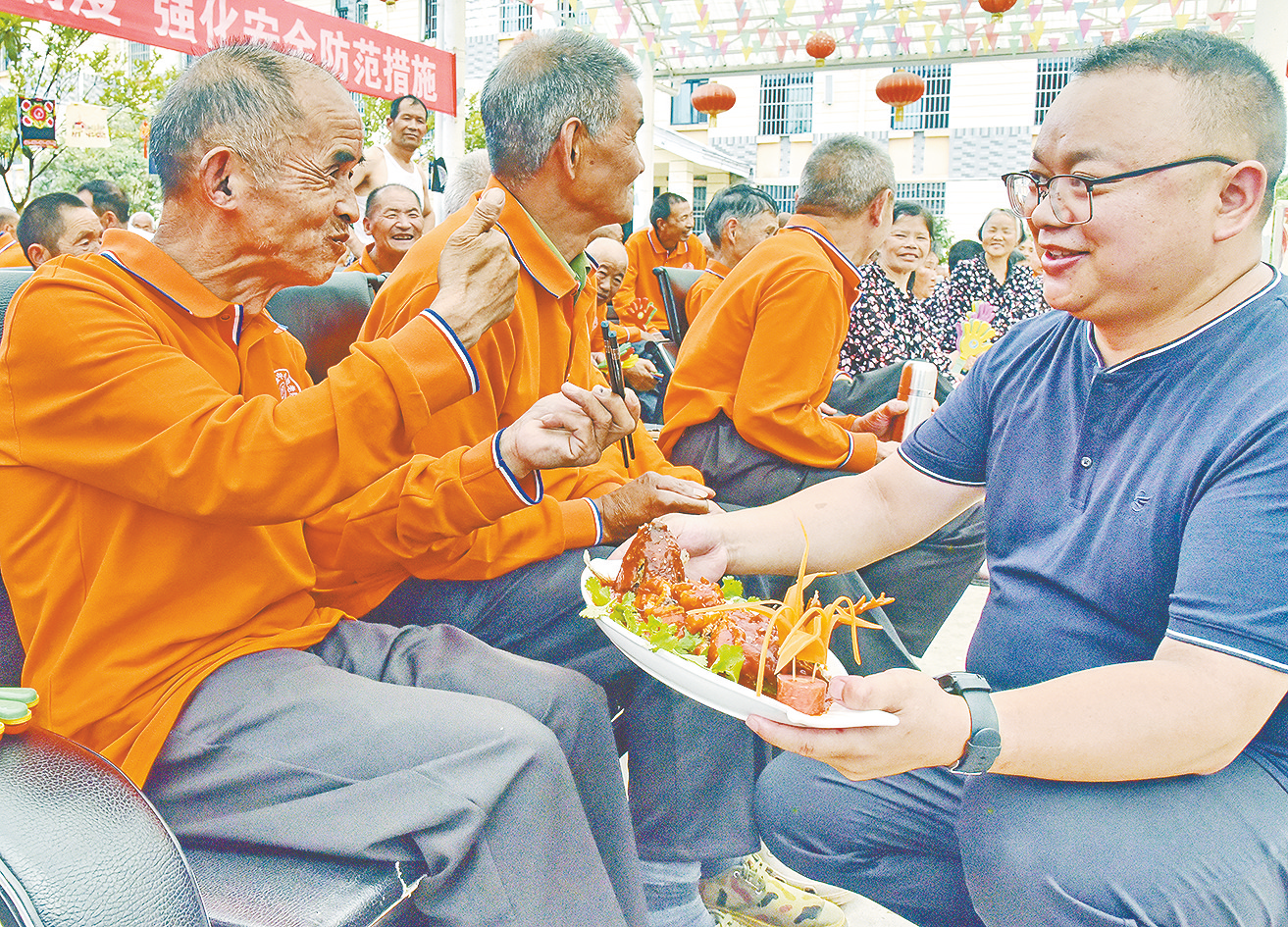 6月16日,宁强县中心敬老院工作人员把可口的松鼠鱼端给老人品尝。