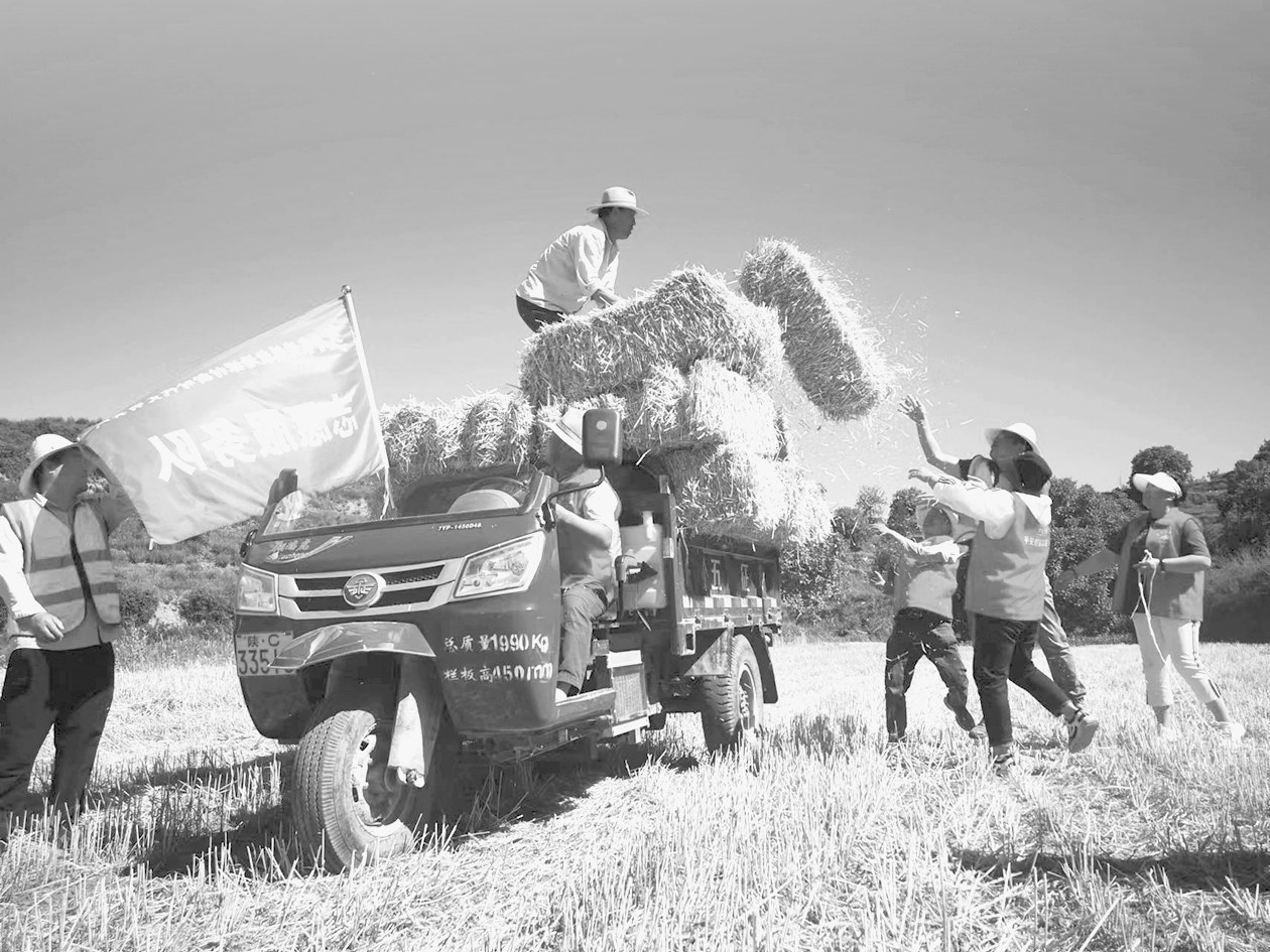 6月16日,在陇县曹家湾镇教场塬村的麦田里,志愿者们帮助群众收麦草。