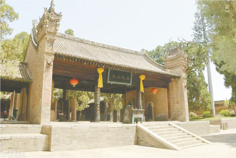下车后,首先看到一个照壁,竖立在大门口平台上,高约五六米,龙脊灰瓦飞檐,四个小垂柱间是祥云雕刻连接,中部有一小神龛,下面有一道圆形小门洞,两边刻着牡丹、莲花灯图案。照壁旁有一株距今约3900年的护庙柏,枝繁叶茂,虬枝盘错。