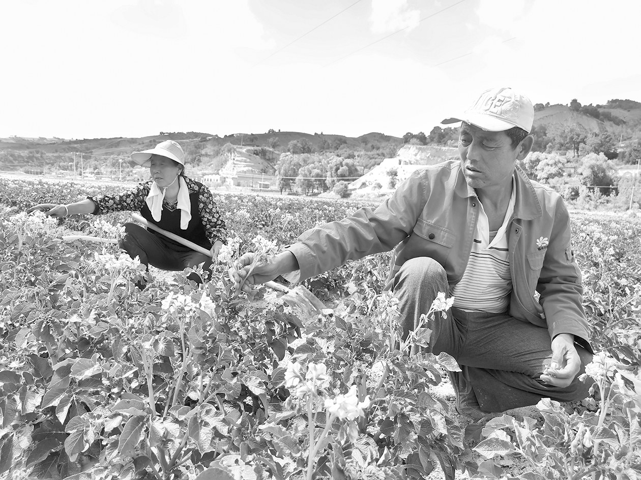 6月15日,在子长市马家砭镇赵家焉村,马铃薯花开正盛,套种玉米、大豆穿插其中,村民们正忙着管护。