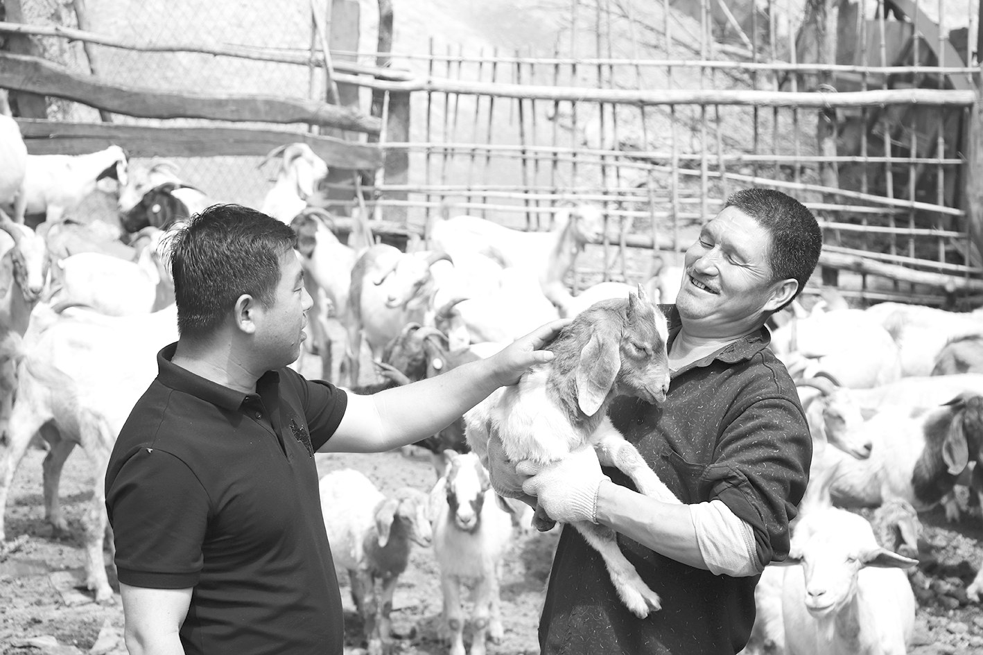 在杨波(左)的帮扶下,村民田福才发展养殖业不仅脱了贫,还成了村里的致富带头人。 本报记者 韩小珍 文/图